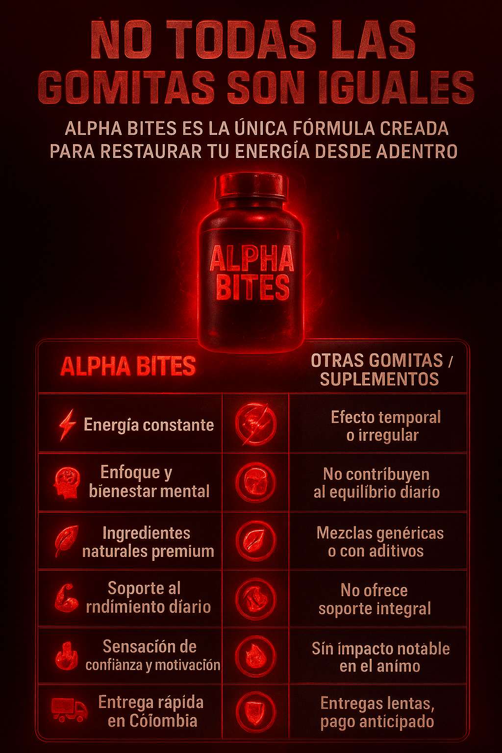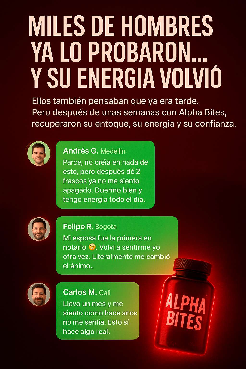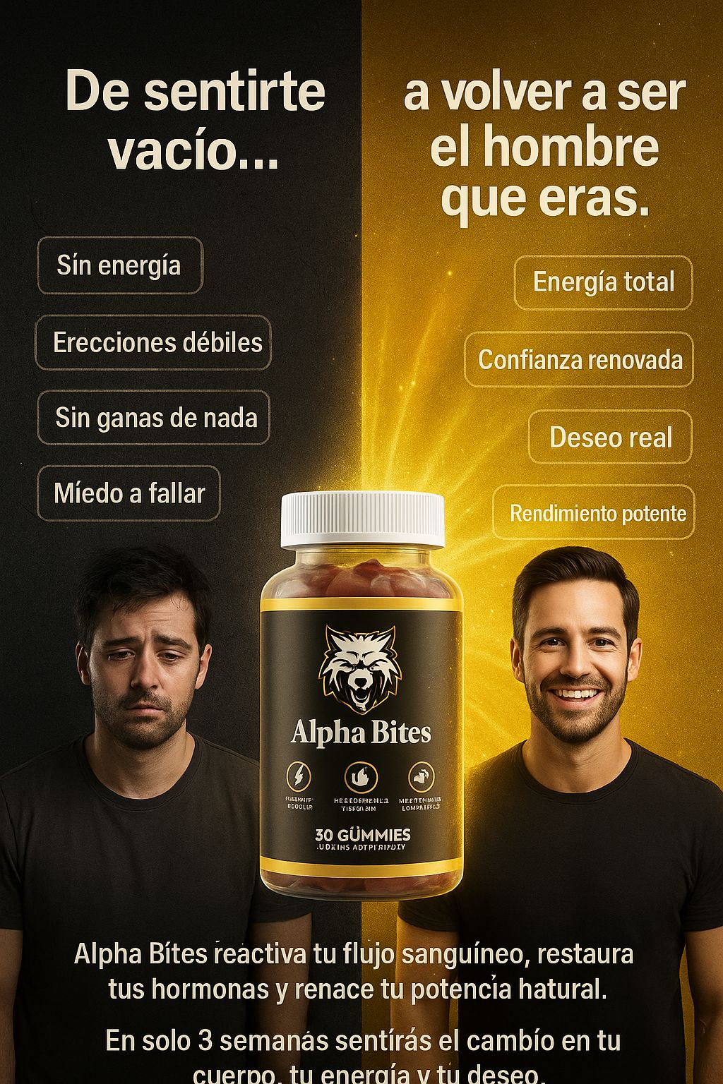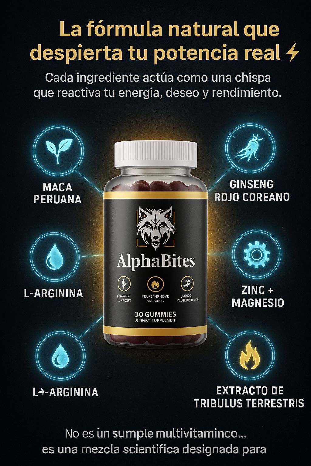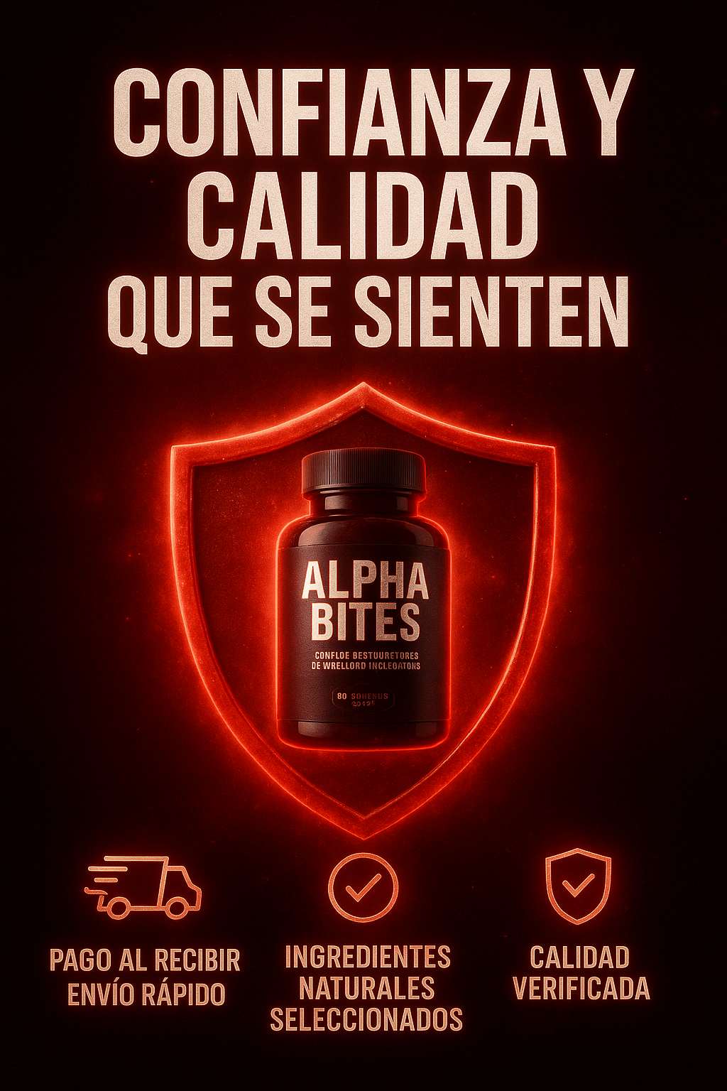 ✅ Alpha Bites está hecho con ingredientes naturales y seguros. No contiene estimulantes agresivos ni químicos raros. Si tienes dudas médicas, consulta con tu doctor antes de empezar.