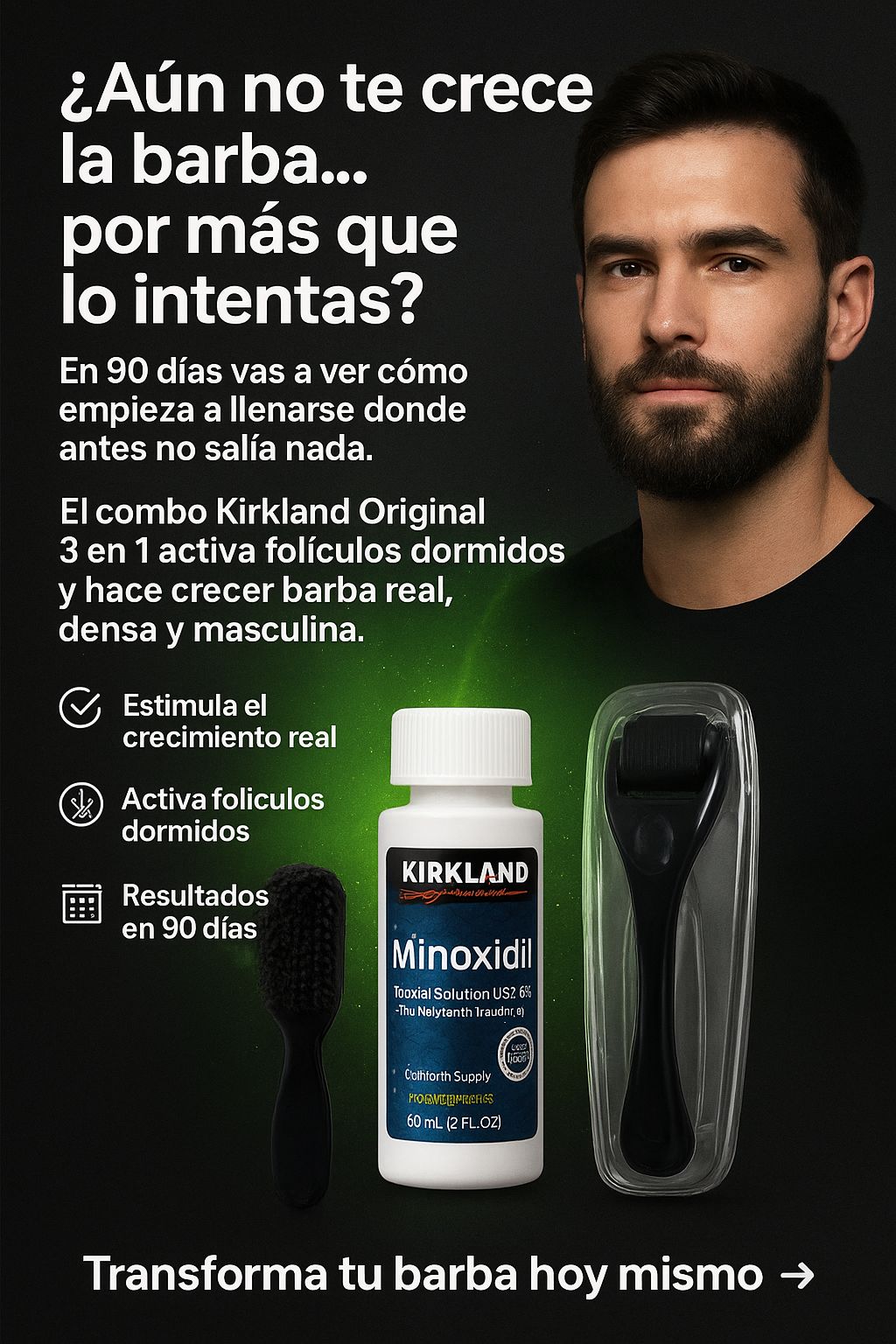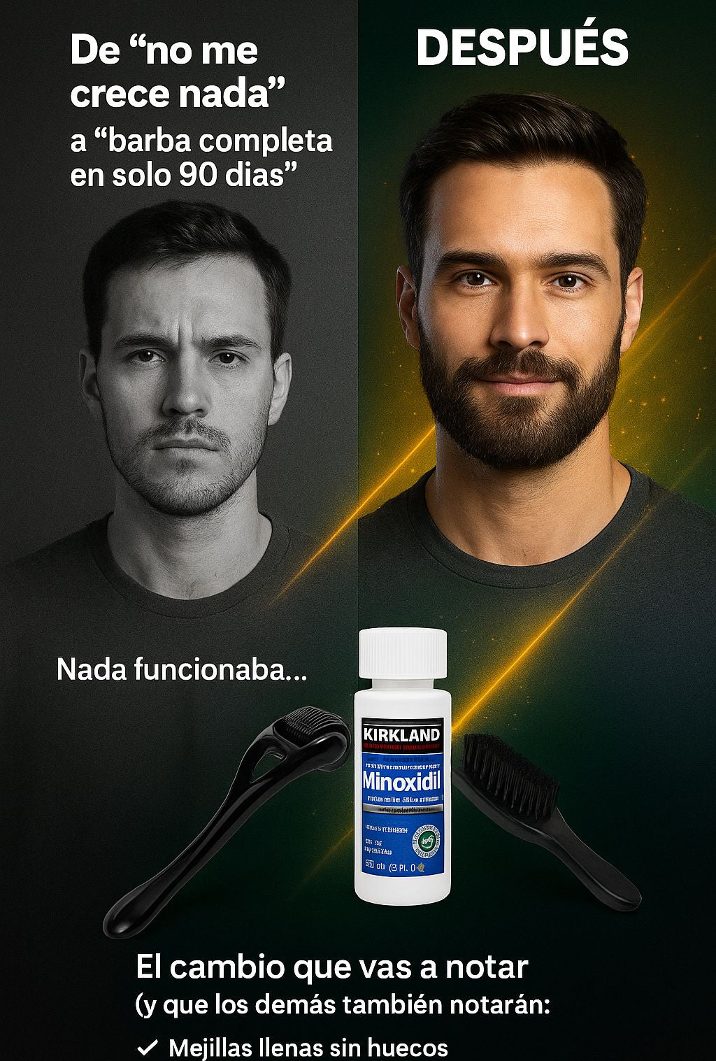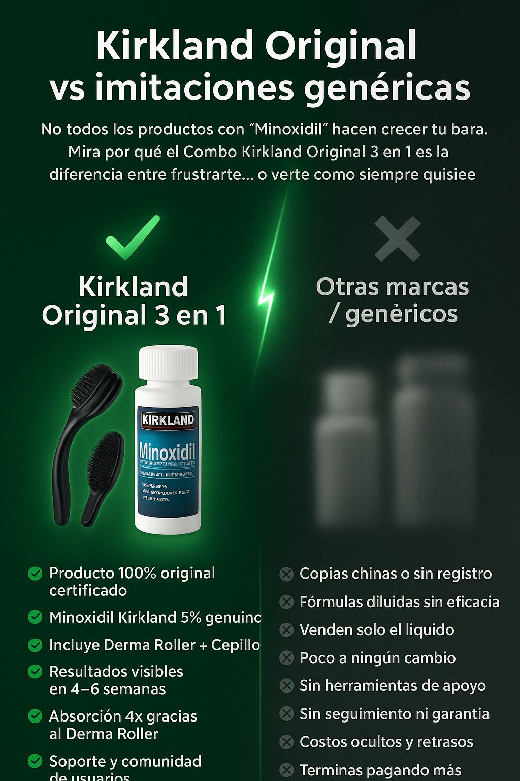 El minoxidil Kirkland 5% es seguro y aprobado por la FDA. Algunos usuarios pueden experimentar leve resequedad o irritación al inicio (normal y temporal). El derma roller debe usarse correctamente (1-2 veces por semana). Incluimos guía completa de uso seguro. No recomendado si tienes piel muy sensible o condiciones dermatológicas activas.
